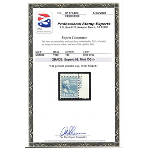 820, Mint NH 15¢ Superb - With Graded 98 PSE Certificate - Stuart Katz