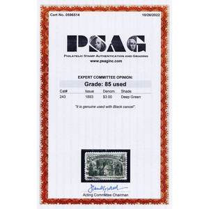 243, Used $3 VF Centering - With PSAG Graded 85 Certificate * Stuart Katz
