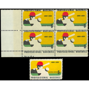 1381 HUGE Black Color Shift ERROR PL# Block of Four 6¢ Baseball - Stuart Katz