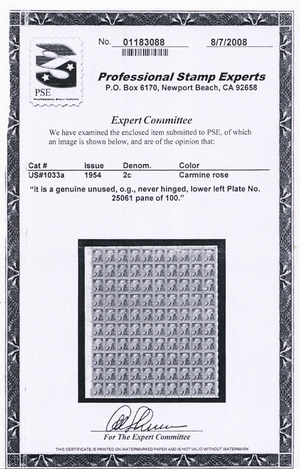 Due to the high cost of obtaining certificates we will only refund the cost of the stamp and not the cost of the certificate for stamps that sell for less than $250 that come back with a negative certificate. Stamps that sell for above $250 will receive a full refund for both the price of the stamp and cost of the certificate if it should come back not as described. For U.S. stamps only certificates from either APS, PSE or from the Philatelic Foundation are accepted, however "graded" certificates or "encased" items are not accepted.