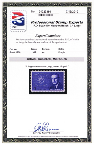 No refunds will be made after 60 days after the sale date unless extra time is granted. Due to the high cost of obtaining certificates we will only refund the cost of the stamp and not the cost of the certificate. For U.S. stamps only certificates from either APS, PSE or from the Philatelic Foundation are accepted, however "graded" certificates or "encased" items are not accepted.