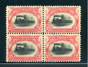 295 Block of 4, 2¢ Pan-American, Mint NH, small oil spot on LR stamp, Scott $160