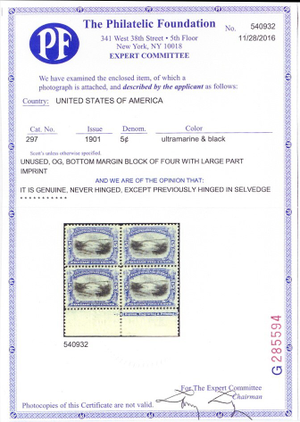 Due to the high cost of obtaining certificates we will only refund the cost of the stamp and not the cost of the certificate for stamps that sell for less than $250 that come back with a negative certificate. Stamps that sell for above $250 will receive a full refund for both the price of the stamp and cost of the certificate if it should come back not as described. For U.S. stamps only certificates from either APS, PSE or from the Philatelic Foundation are accepted, however "graded" certificates or "encased" items are not accepted.