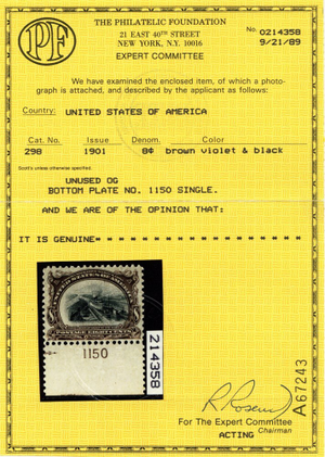 Due to the high cost of obtaining certificates we will only refund the cost of the stamp and not the cost of the certificate for stamps that sell for less than $250 that come back with a negative certificate. Stamps that sell for above $250 will receive a full refund for both the price of the stamp and cost of the certificate if it should come back not as described. For U.S. stamps only certificates from either APS, PSE or from the Philatelic Foundation are accepted, however "graded" certificates or "encased" items are not accepted.