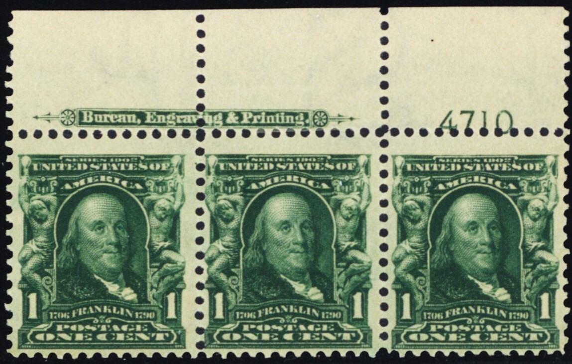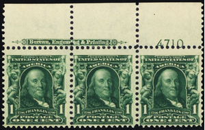300, Mint NH Fine 1¢ Top PL# & Imprint Strip of 3 Stamps * Stuart Katz