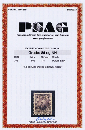 308, Mint VF/XF NH 13¢ With Graded 85 PSAG Certificate - Stuart Katz