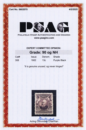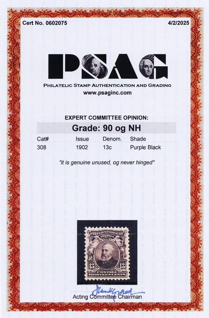 308, Mint XF NH 13¢ With Graded 90 PSAG Certificate - Stuart Katz