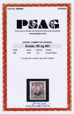 308, Mint XF NH 13¢ With Graded 90 PSAG Certificate - Stuart Katz