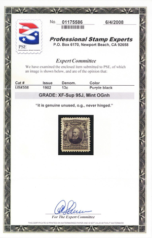 308, Mint XF/Superb NH 13¢ - PSE Graded 95J JUMBO Certificate - Stuart Katz