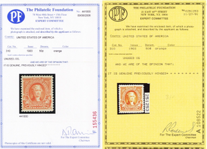 No refunds will be made after 60 days after the sale date unless extra time is granted. Due to the high cost of obtaining certificates we will only refund the cost of the stamp and not the cost of the certificate. For U.S. stamps only certificates from either APS, PSE or from the Philatelic Foundation are accepted, however "graded" certificates or "encased" items are not accepted.