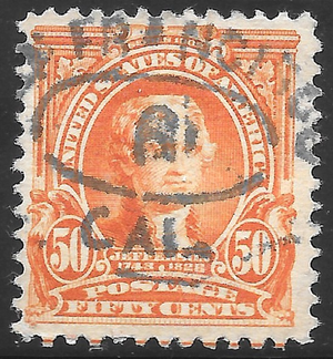 VF USED Scott #310 50-cent Thomas Jefferson issue, on double line watermarked paper from the always popular series of 1902. Sharp looking stamp with really nice San Francisco California cancel on it.
