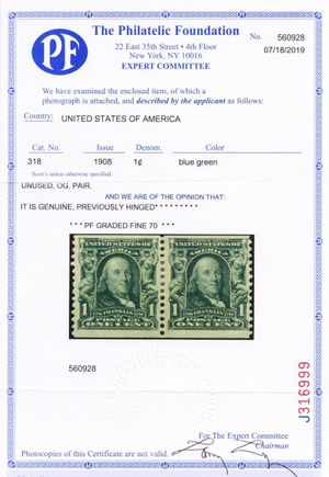 318, Mint Hinged 1¢ GENUINE Coil Pair - PFC Certificate - Stuart Katz