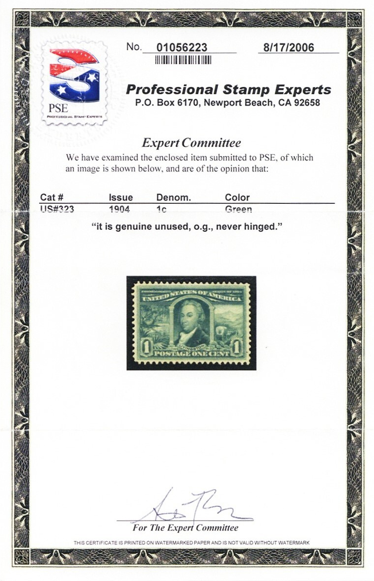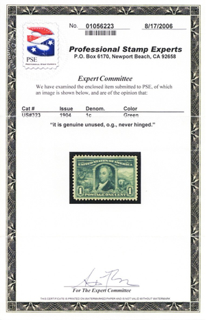 Due to the high cost of obtaining certificates we will only refund the cost of the stamp and not the cost of the certificate for stamps that sell for less than $250 that come back with a negative certificate. Stamps that sell for above $250 will receive a full refund for both the price of the stamp and cost of the certificate if it should come back not as described. For U.S. stamps only certificates from either APS, PSE or from the Philatelic Foundation are accepted, however "graded" certificates or "encased" items are not accepted.