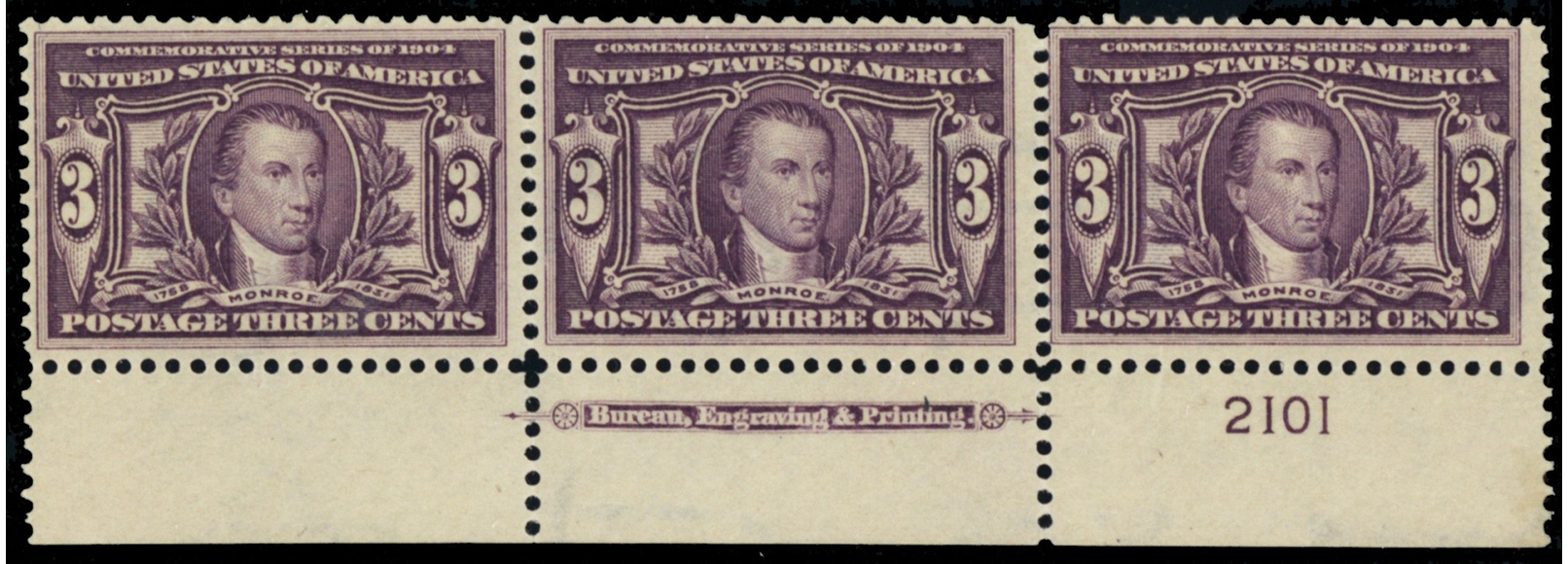 325, Mint 2 LH - 1 NH 3¢ PL# & Imprint Strip of 3 - Stuart Katz
