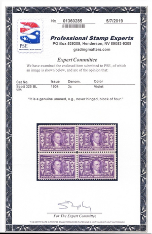 325, Mint F-VF NH 3¢ Block of Four With PSE Certificate - Stuart Katz