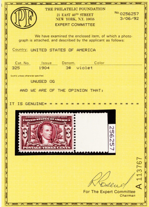 Due to the high cost of obtaining certificates we will only refund the cost of the stamp and not the cost of the certificate for stamps that sell for less than $250 that come back with a negative certificate. Stamps that sell for above $250 will receive a full refund for both the price of the stamp and cost of the certificate if it should come back not as described. For U.S. stamps only certificates from either APS, PSE or from the Philatelic Foundation are accepted, however "graded" certificates or "encased" items are not accepted.