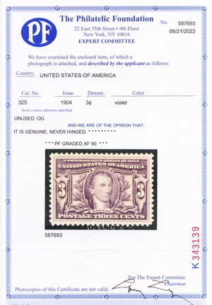 325, Mint XF NH 3¢ - With PFC Graded 90 Certificate - Stuart Katz