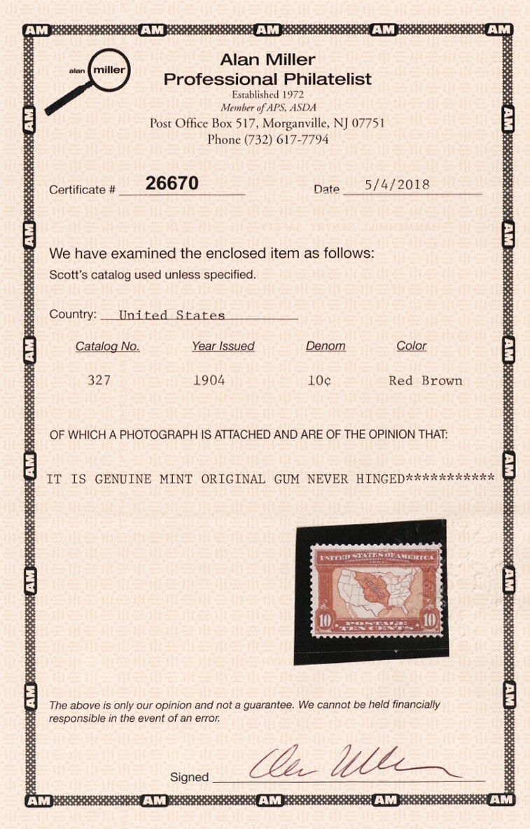 327, Mint VF NH 10¢ - With Certificate - Stuart Katz