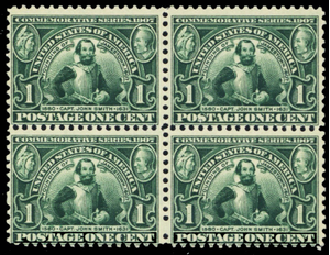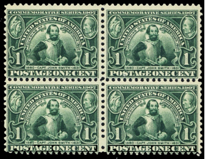 328, Mint OG NH 1¢ Jamestown Block Of Four Stamps Cat $260.00 - Stuart Katz