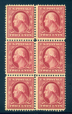 332 3mm Spacing Block of 6, 2¢ Washington, Mint NH, one stamp LH, Scott $89+