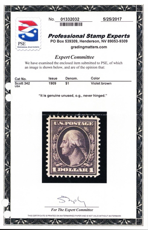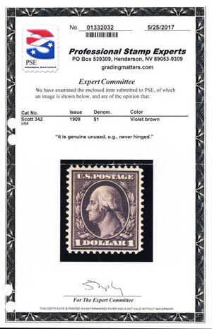 342, Mint VF NH $1 With PSE Certificate - VERY FRESH * Stuart Katz