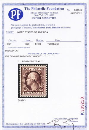 342, Mint XF VLH $1 - GEM With PFC Graded 90 Certificate - Stuart Katz