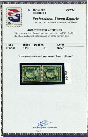 348, Mint VF NH 1¢ Coil Pair With PSE Certificate * Stuart Katz