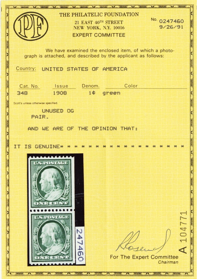 Due to the high cost of obtaining certificates we will only refund the cost of the stamp and not the cost of the certificate for stamps that sell for less than $250 that come back with a negative certificate. Stamps that sell for above $250 will receive a full refund for both the price of the stamp and cost of the certificate if it should come back not as described. For U.S. stamps only certificates from either APS, PSE or from the Philatelic Foundation are accepted, however "graded" certificates or "encased" items are not accepted.