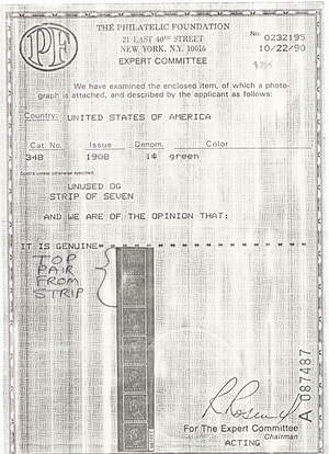 Due to the high cost of obtaining certificates we will only refund the cost of the stamp and not the cost of the certificate for stamps that sell for less than $250 that come back with a negative certificate. Stamps that sell for above $250 will receive a full refund for both the price of the stamp and cost of the certificate if it should come back not as described. For U.S. stamps only certificates from either APS, PSE or from the Philatelic Foundation are accepted, however "graded" certificates or "encased" items are not accepted.