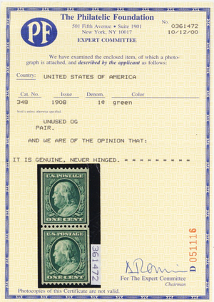 348, Mint VF/XF NH 1¢ Coil Pair With PFC Certificate - Stuart Katz