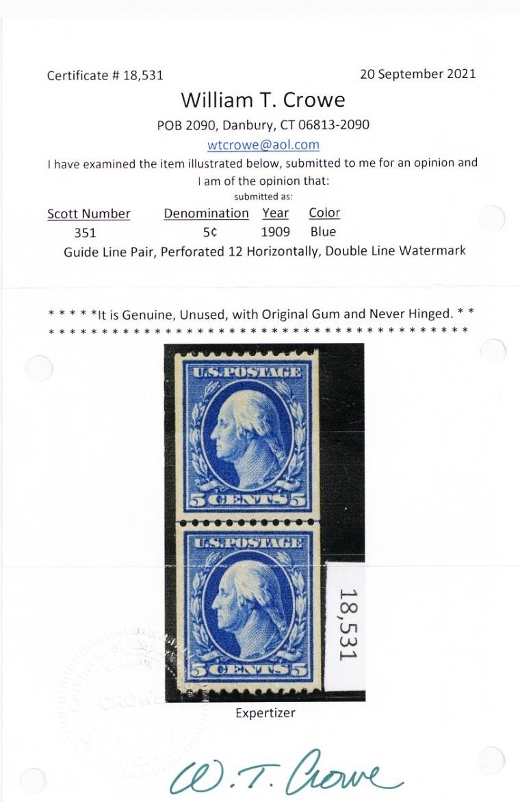 351, Mint XF NH 5¢ Coil Line Pair With PFC Certificate * Stuart Katz