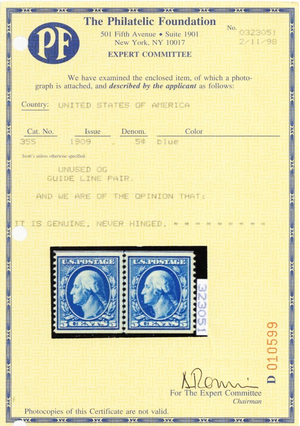 No refunds will be made after 60 days after the sale date unless extra time is granted. Due to the high cost of obtaining certificates we will only refund the cost of the stamp and not the cost of the certificate. For U.S. stamps only certificates from either APS, PSE or from the Philatelic Foundation are accepted, however "graded" certificates or "encased" items are not accepted.