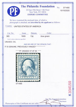 365, Mint VLH VF/XF 13¢ Blue Paper - Graded 85 PFC Certificate * Stuart Katz