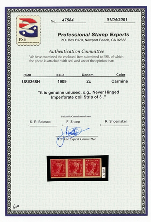 368H, Mint NH VF 2¢ Imperforate Coil Strip With PSE Certificate * Stuart Katz