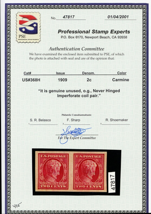 368H, Mint NH XF 2¢ Imperforate Coil Pair With PSE Certificate - Stuart Katz