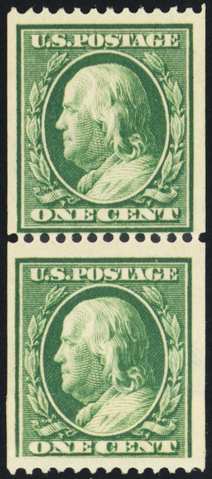 385, Mint NH 1¢ Coil Pair With Paste-up tab on Bottom Stamp - Stuart Katz