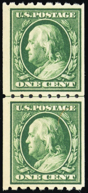 390, Mint VF NH 1¢ Coil Line Pair Cat $72.50 - Stuart Katz