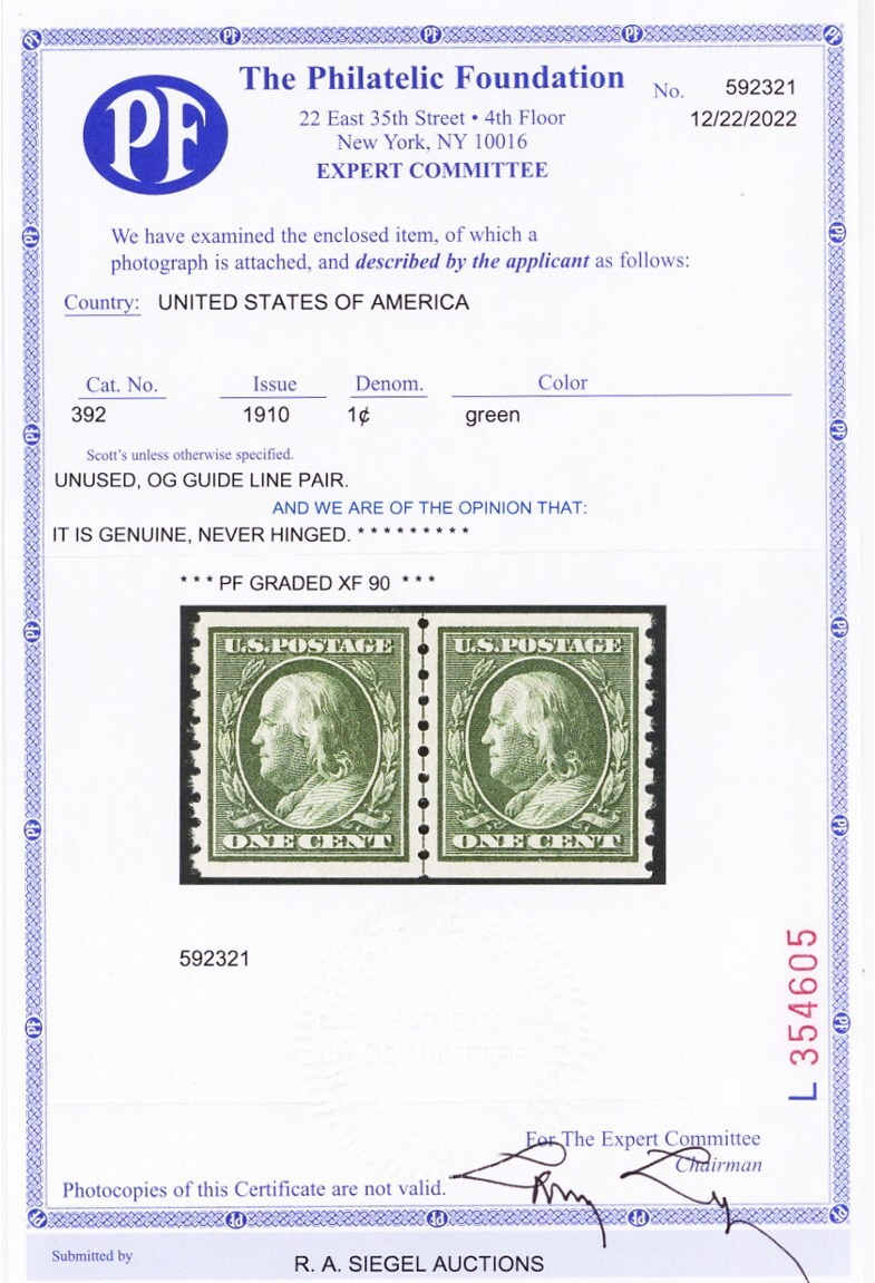 392, Mint XF NH Coil Line Pair - With Graded 90 PFC Certificate * Stuart Katz