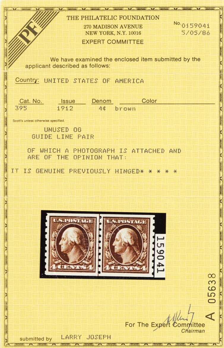 395, Mint VF VLH 4¢ Coil Line Pair - With PFC Certificate - Stuart Katz