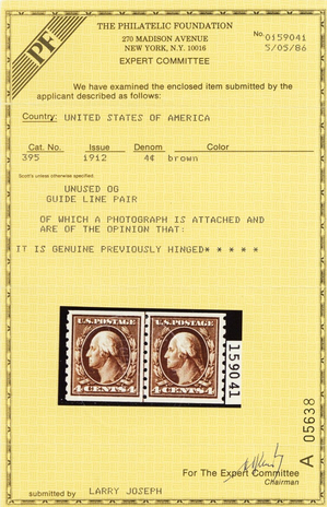 Due to the high cost of obtaining certificates we will only refund the cost of the stamp and not the cost of the certificate for stamps that sell for less than $250 that come back with a negative certificate. Stamps that sell for above $250 will receive a full refund for both the price of the stamp and cost of the certificate if it should come back not as described. For U.S. stamps only certificates from either APS, PSE or from the Philatelic Foundation are accepted, however "graded" certificates or "encased" items are not accepted.