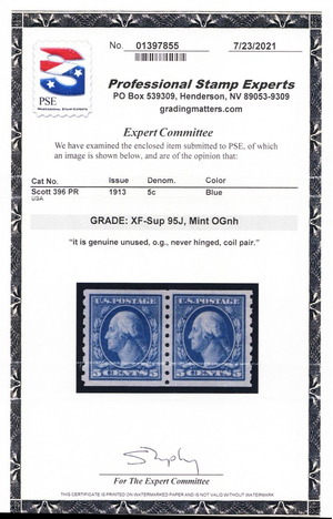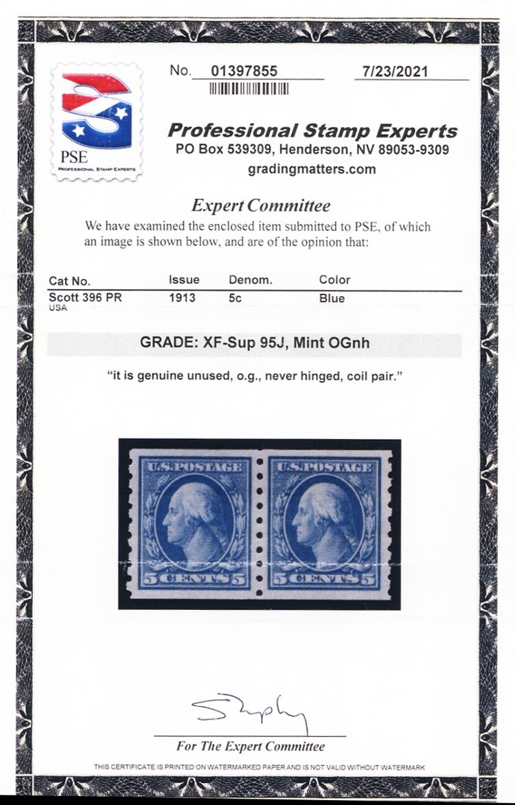 396, Mint NH XF/Superb 5¢ Coil Pair - PSE Graded 95J JUMBO Cert - Stuart Katz