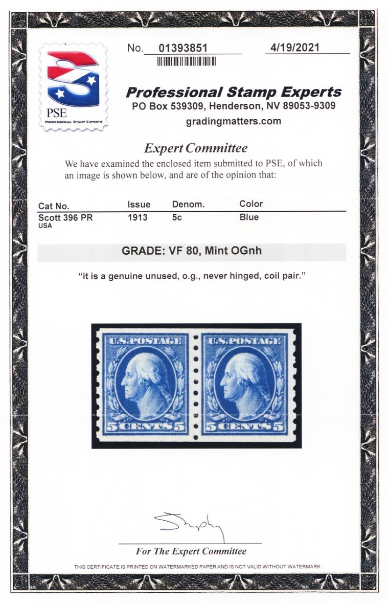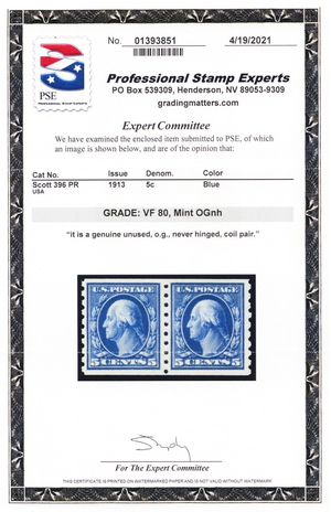 396, Mint VF NH 5¢ Coil Pair - With Graded PSE Certificate - Stuart Katz