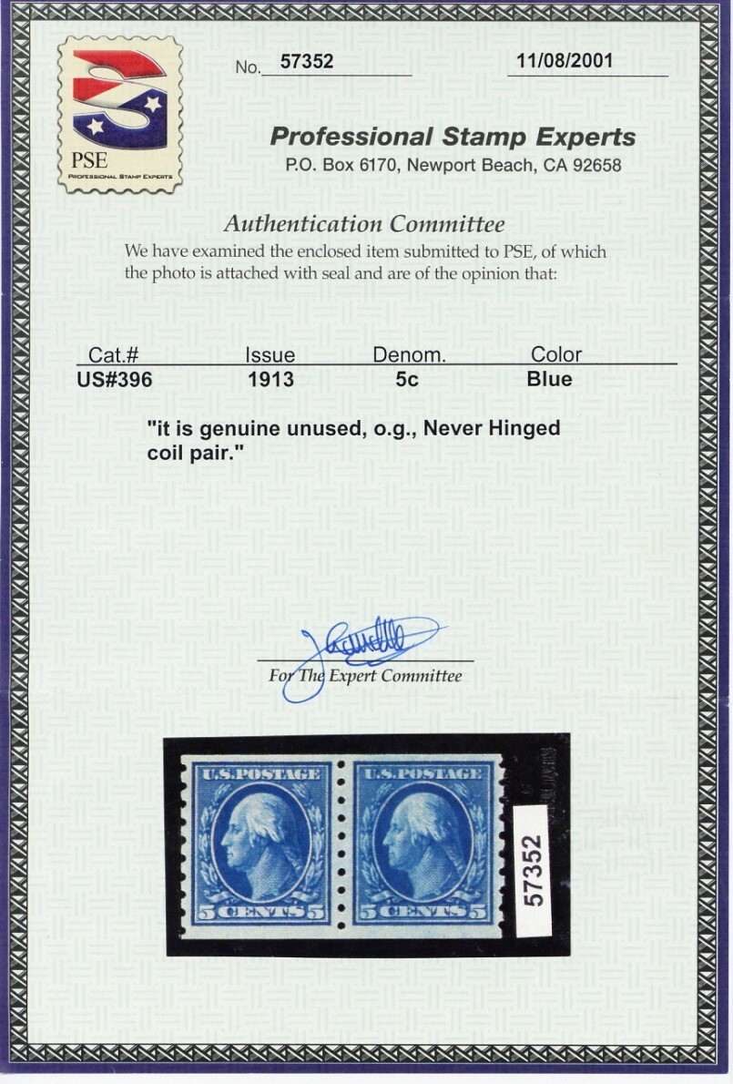 396, Mint VF NH 5¢ Coil Pair - With PSE Certificate - Stuart Katz