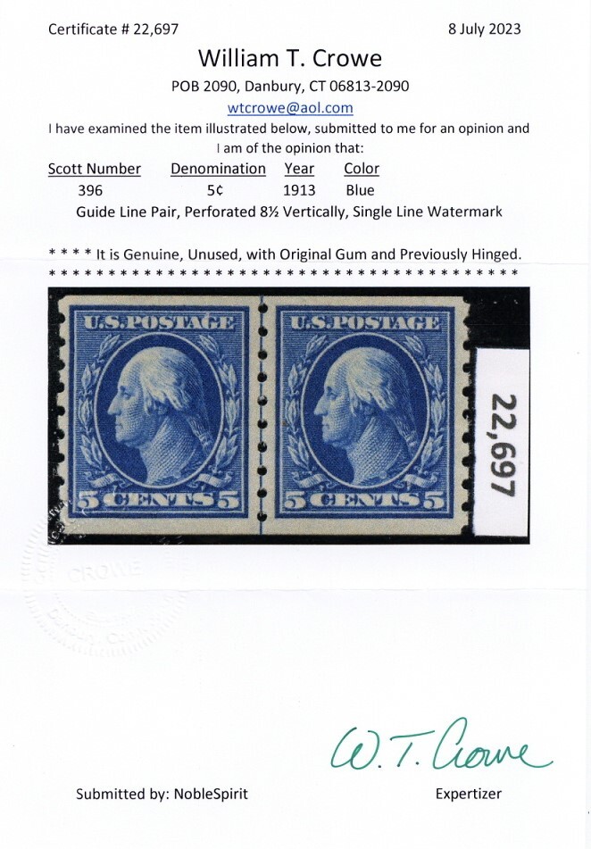 396, Mint VF VLH Coil Line Pair With Certificate - Stuart Katz