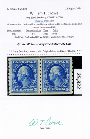 396, Mint VF/XF NH 5¢ Coil Pair - Graded 85 Certificate - Stuart Katz