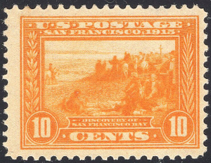 | #400 F-VF MNH OG-10¢ Orange Yellow-PANAMA-PACIFIC SERIES For sale is an F-VF MNH OG Scott #400 10¢ Orange Yellow Shade from the Panama-Pacific Expo series depicting San Francisco Bay. This is a remarkably fresh stamp and and as most advanced collectors know this series is usually poorly centered.