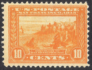 | #400 F-VF LH OG-10¢ Orange Yellow-PANAMA-PACIFIC SERIES For sale is an XF VLH OG Scott #400A 10¢ Orange Yellow Shade from the Panama-Pacific Expo series depicting San Francisco Bay. This is a remarkably fresh stamp and and as most advanced collectors know this series is usually poorly centered.