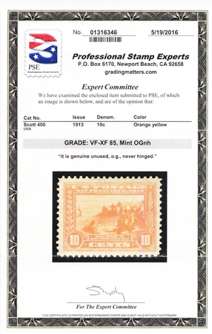 Due to the high cost of obtaining certificates we will only refund the cost of the stamp and not the cost of the certificate for stamps that sell for less than $250 that come back with a negative certificate. Stamps that sell for above $250 will receive a full refund for both the price of the stamp and cost of the certificate if it should come back not as described. For U.S. stamps only certificates from either APS, PSE or from the Philatelic Foundation are accepted, however "graded" certificates or "encased" items are not accepted.