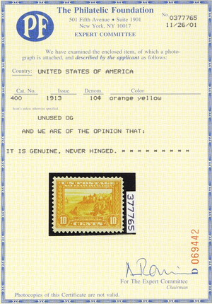 Due to the high cost of obtaining certificates we will only refund the cost of the stamp and not the cost of the certificate for stamps that sell for less than $250 that come back with a negative certificate. Stamps that sell for above $250 will receive a full refund for both the price of the stamp and cost of the certificate if it should come back not as described. For U.S. stamps only certificates from either APS, PSE or from the Philatelic Foundation are accepted, however "graded" certificates or "encased" items are not accepted.
