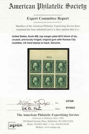 408, Mint XF LH Kansas City Perfs - RARE Plate Block APS Cert - * Stuart Katz